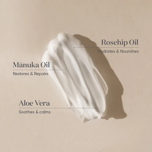 Aqua (Water), Glycerin, Cetearyl Alcohol, Propanediol, Decyl Oleate, Betaine, Aloe Barbadensis Leaf Juice, Leptospermum Scoparium (Mānuka Oil) Branch/Leaf Oil, Rosa Canina (Rosehip) Fruit Oil, Fructose, Inulin, Benzyl Alcohol, Lauryl Glucoside, Sorbitan Olivate, Xanthan Gum, Tocopherol, Parfum (Fragrance), Potassium Sorbate, Helianthus Annuus (Sunflower) Seed Oil, Sodium Phytate, Dehydroacetic Acid, Linalool, Geraniol, Limonene